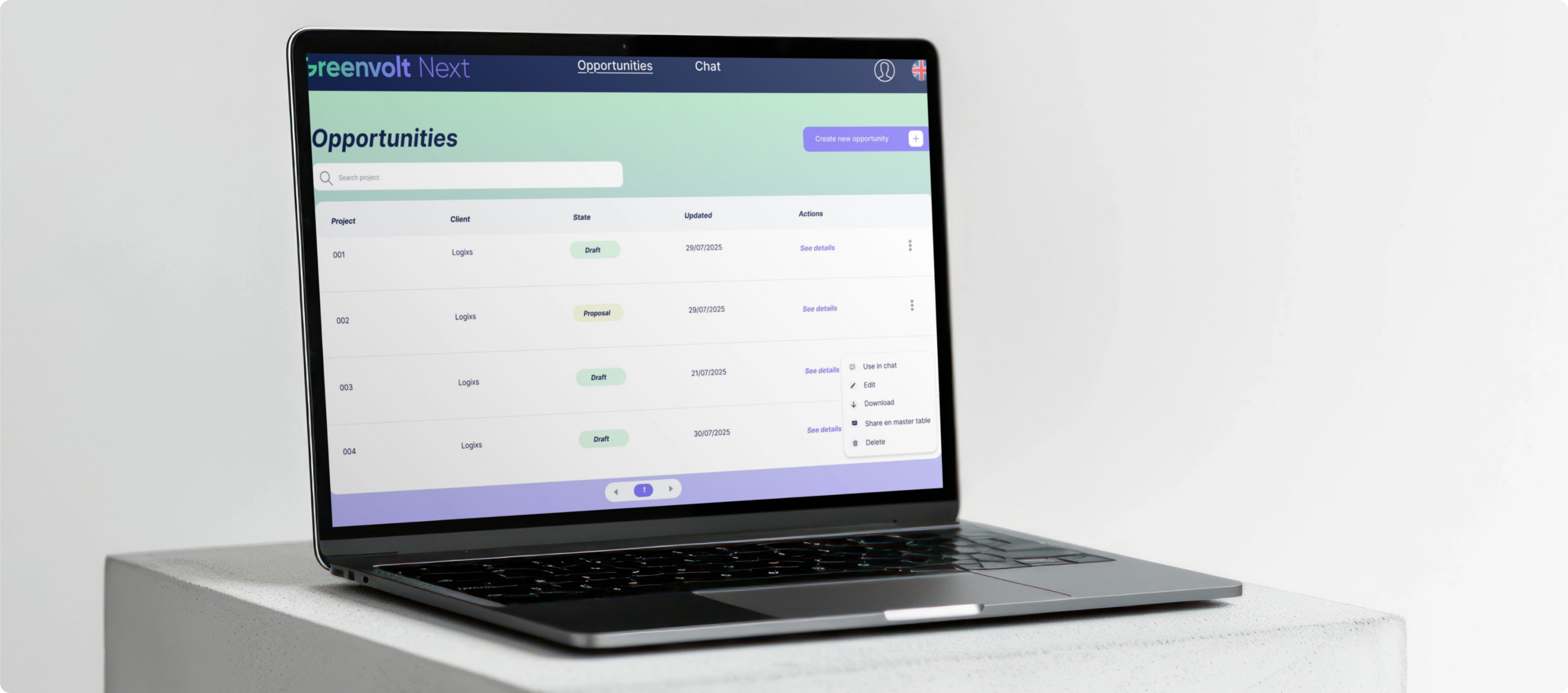 Desarrollamos para Greenvolt una plataforma integral de gestión de oportunidades, cálculo técnico y análisis avanzado que unifica datos, automatiza procesos complejos y permite comparar escenarios, generar versiones, compartir propuestas y validar cálculos con ayuda de IA.